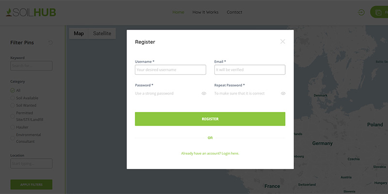 • Register yourself as either having Surplus/Deficit of Soil, an Environmental Consultant, a Haulier, or a Landfill Operator.