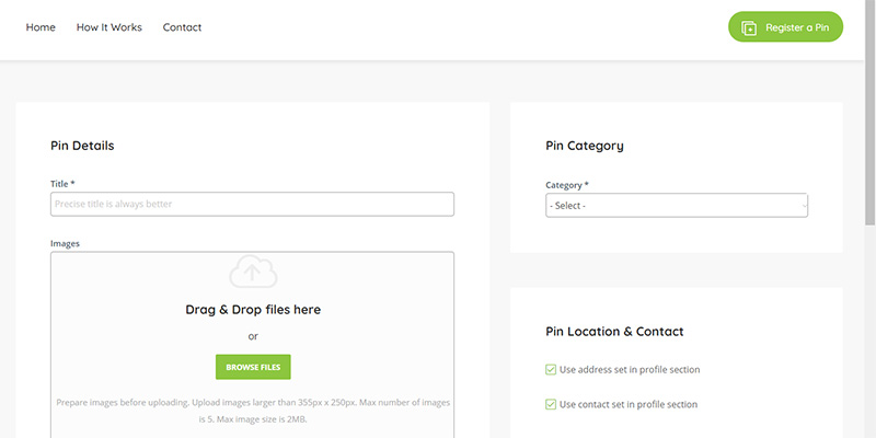 Once you are finished with creating your account it is time to register your pin. Click the ‘Register a Pin’ button and complete the form with as much information as you can provide. Then sit back and wait for interested parties to contact you.